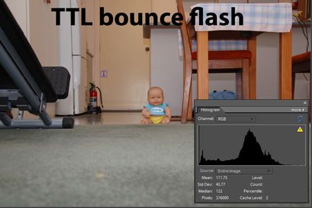 This is a toughie. The center-weighted metering of TTL can create over/underexposure of your subject. As demonstrated below, a black object in the center overexposed your subject (the doll), because the TTL flash was trying to make the center (black) 18% gray, and in the process just poured too much light on the doll (your real subject) as well.